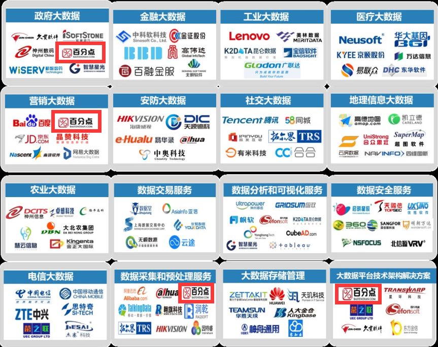 《白皮书》指出了四个大数据热点应用领域:政府大数据、金融大数据、工业大数据和营销大数据等。百分点集团一直深耕政府公共事务、金融、制造、媒体出版等行业,踩准了行业热点,凭借在政府公共事务及营销业务中以底层平台为支撑、实际业务应用为导向,加速行业大数据解决方案的落地,在多个领域入选大数据产业链全景图。